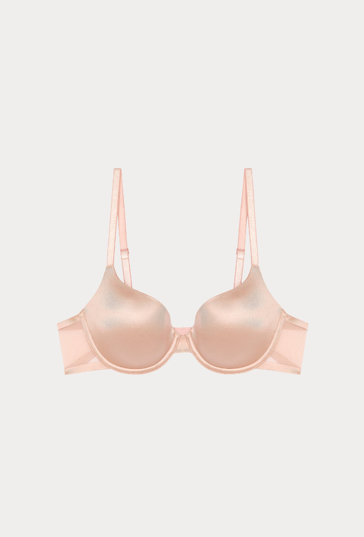 An invisible, lightweight, and flattering basic with a shiny microfiber. The BIANCA T-shirt bra is a basic designed for discretion and everyday comfort. Its full-cup shape smooths the silhouette without adding bulk, while its mesh-lined cups in larger sizes ensure a reliable and breathable fit. Perfect under a T-shirt or shirt, it combines support and invisibility.